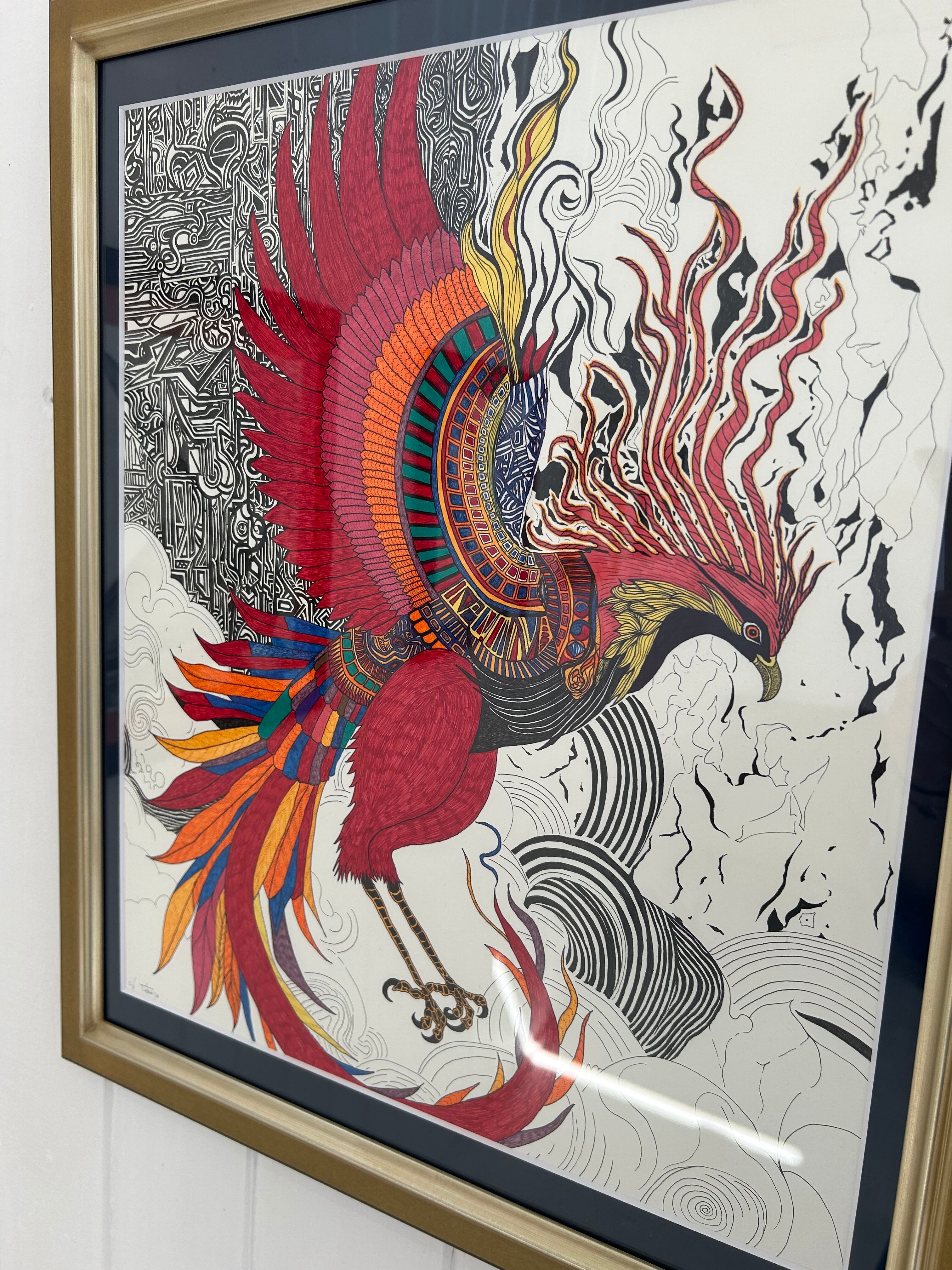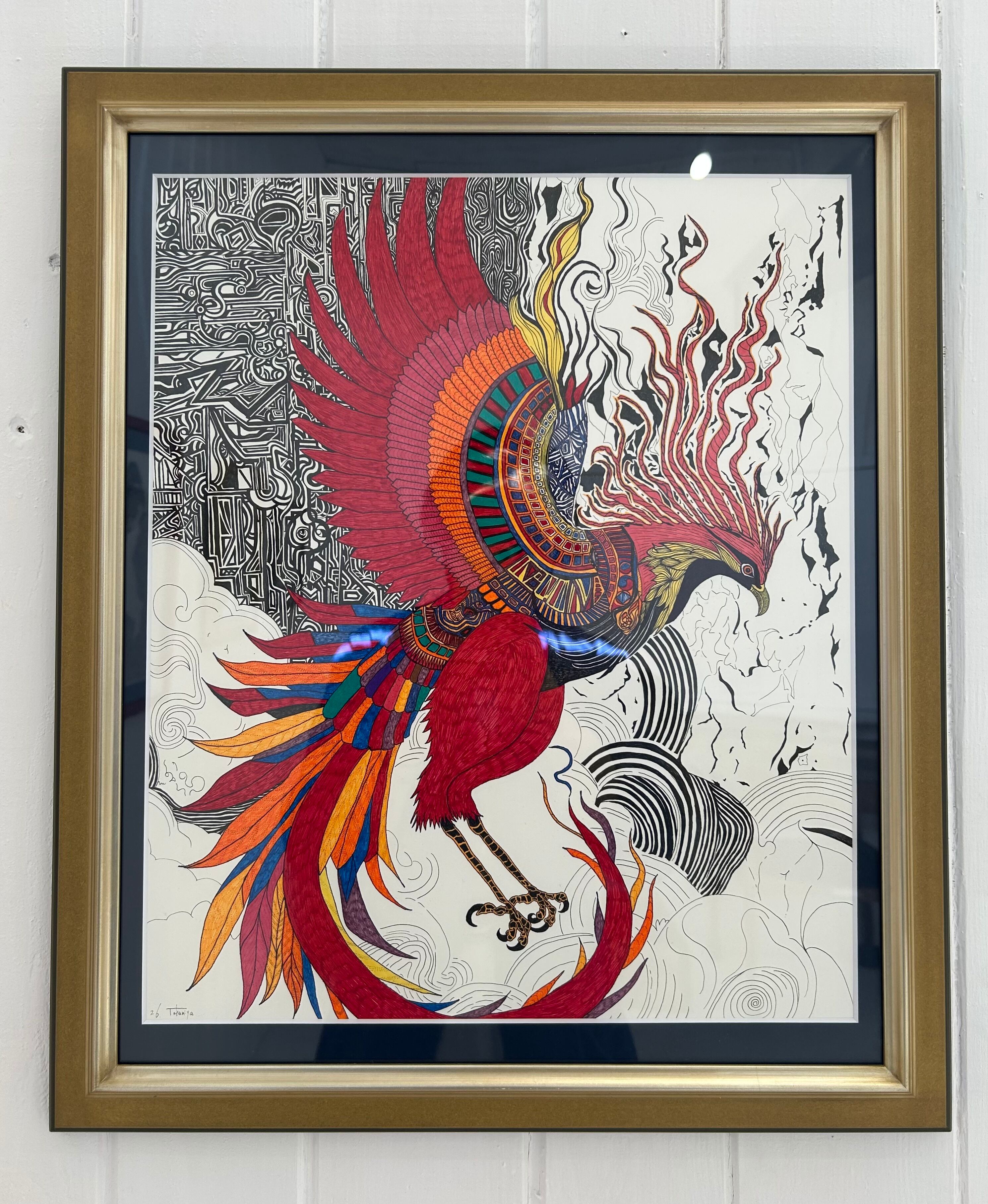 【サインペン画/鳳凰】56.5㎝×48㎝/額装済/手書き/一点もの