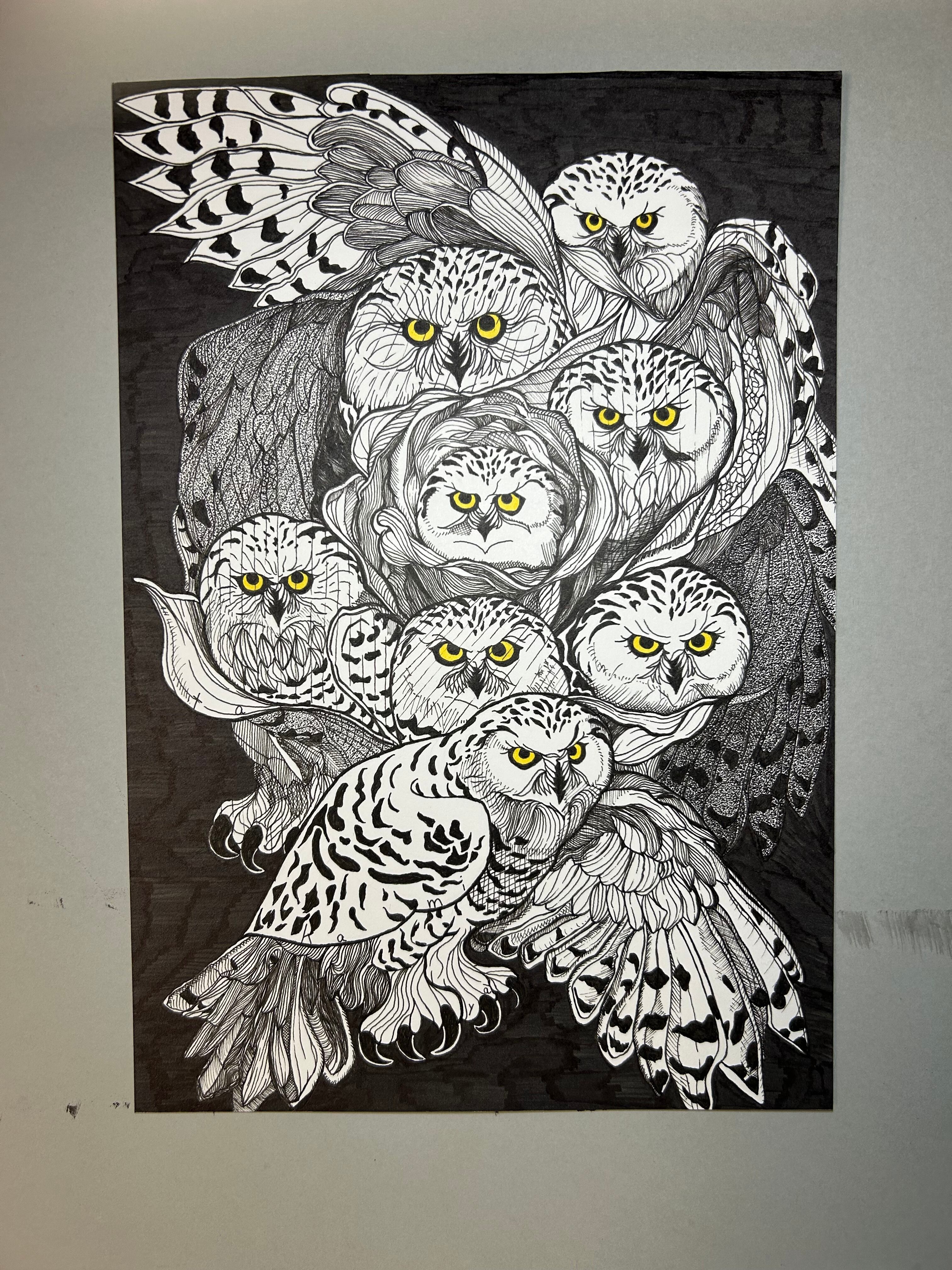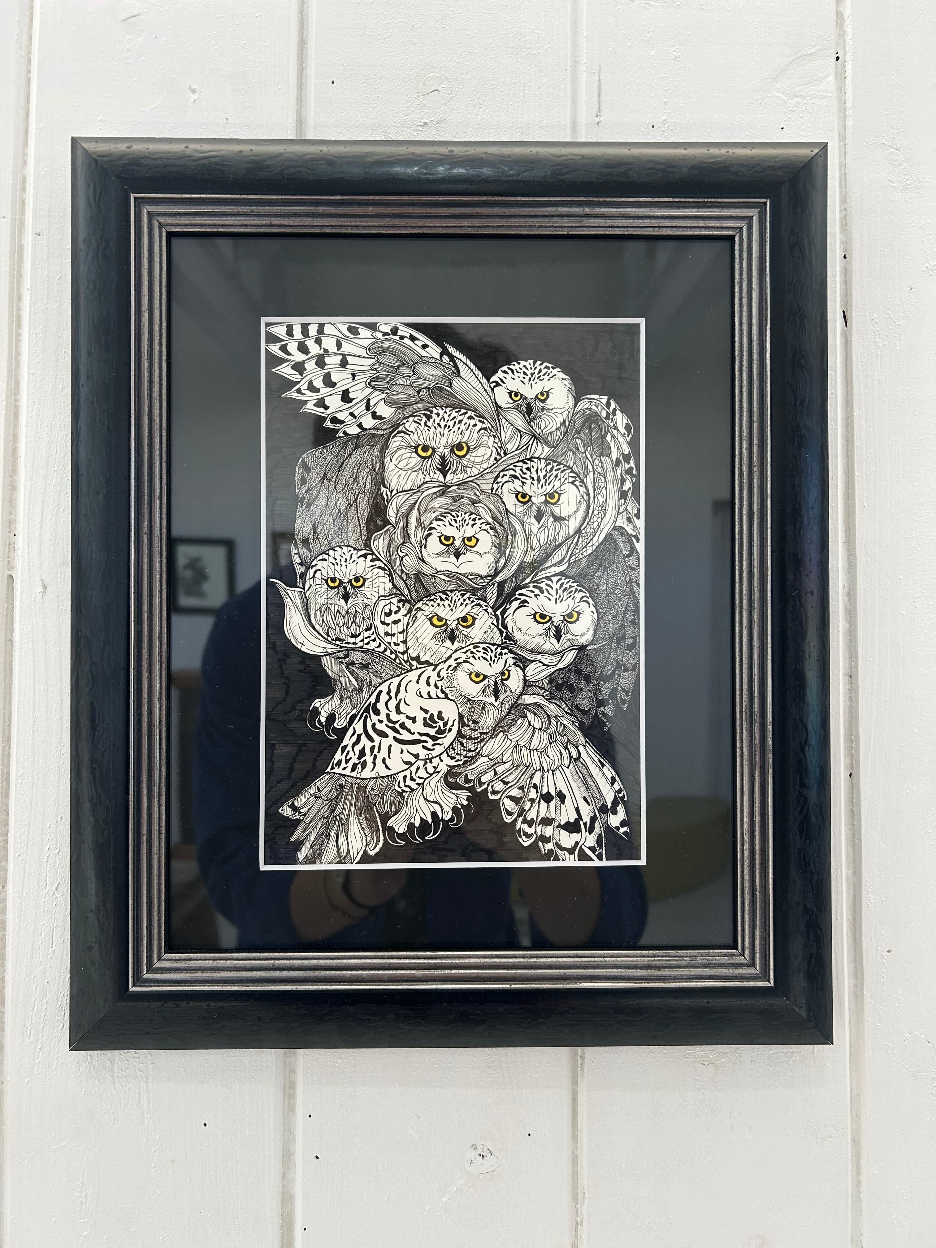 【サインペン画/梟薔薇】37㎝×31.5㎝/額装済/手書き/一点もの