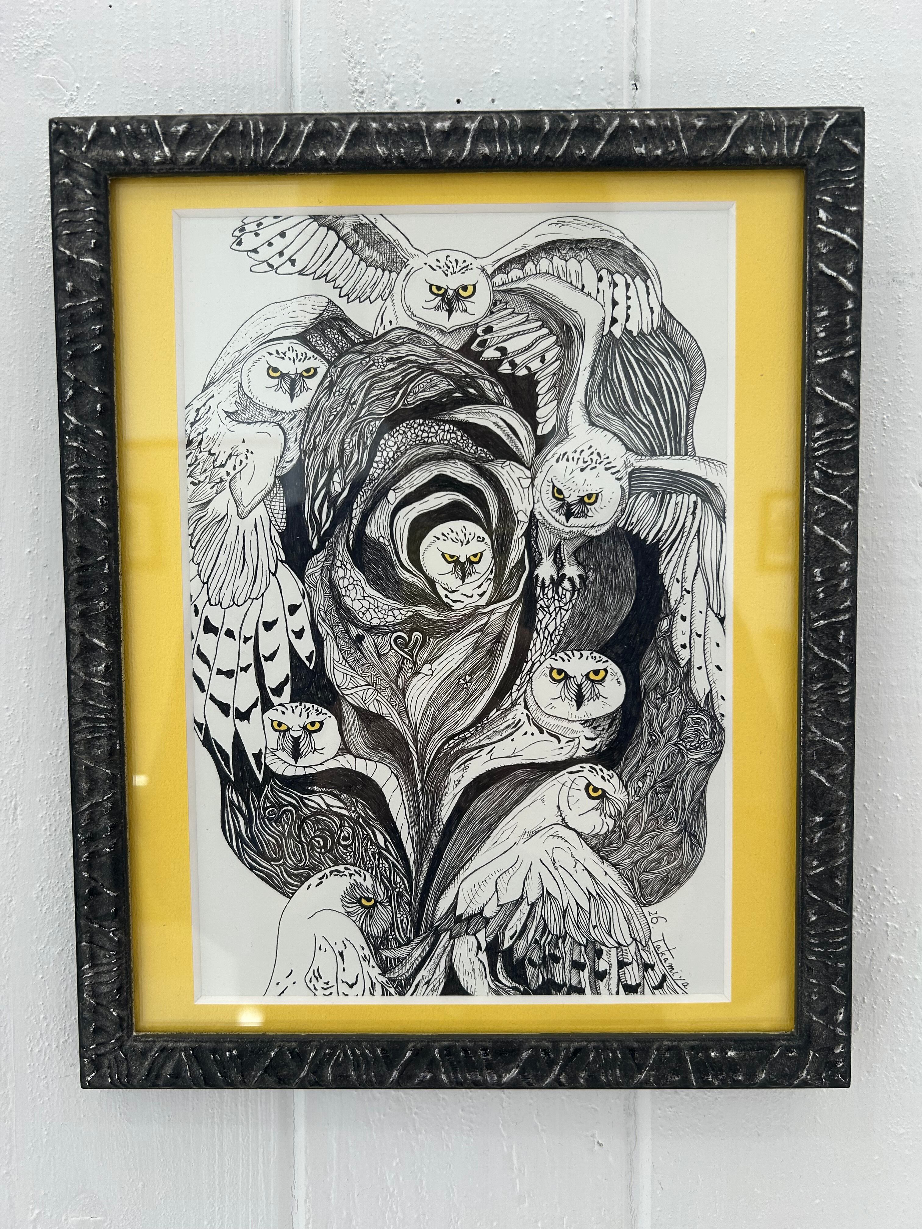 【サインペン画/梟キイロ薔薇】27.5㎝×22.5㎝/額装済/手書き/一点もの